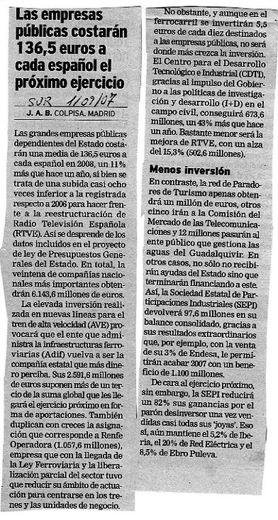Las empresas publicas costarán 136,5 € a cada español el próximo ejercicio. |
