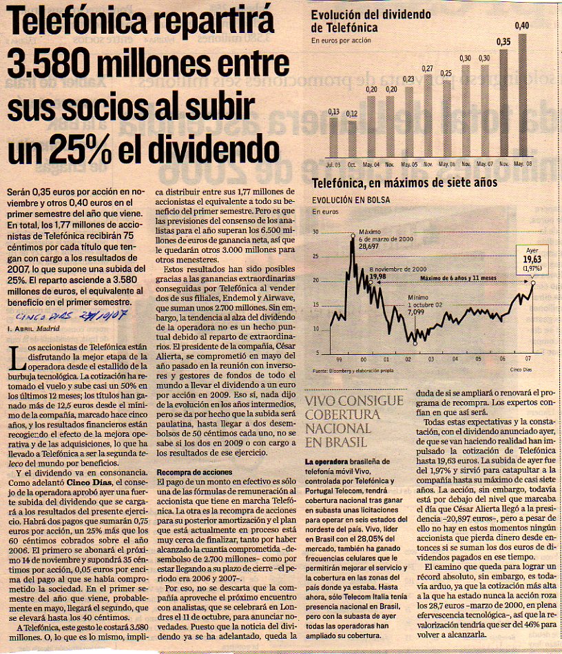 Telefónica repartirá 3.580 millones entre sus propios socios al subir un 25% el dividendo |