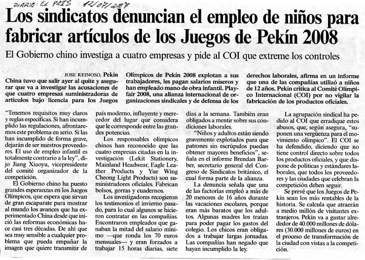 Los sindicatos denuncian el empleo de niños para fabricar artículos de los Juegos de Pekín 2008